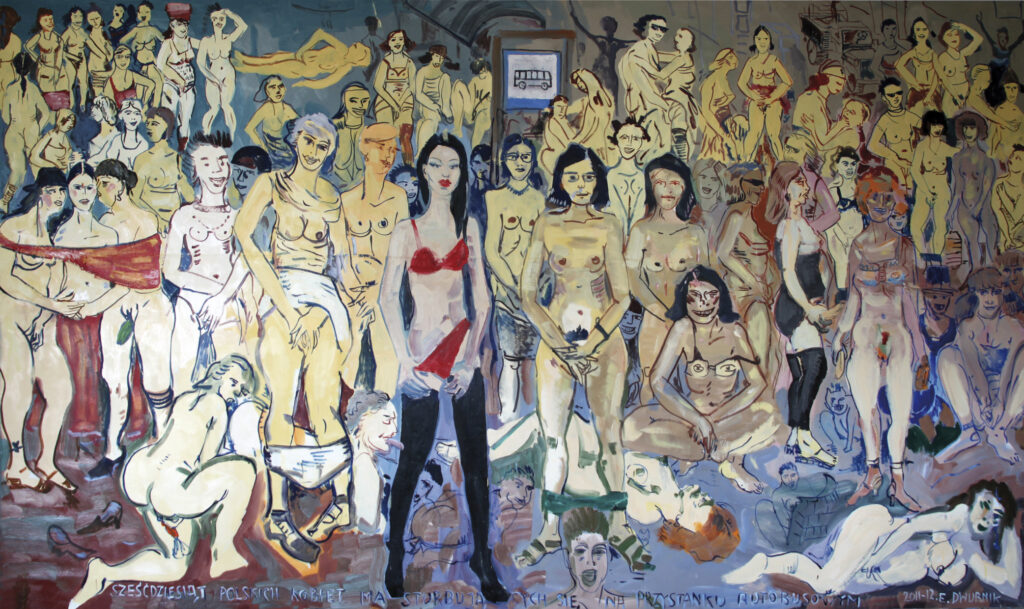 Stojąc przed imponującym obrazem Edwarda Dwurnika Sześćdziesiąt polskich kobiet masturbujących się na przystanku autobusowym w pierwszej chwili chciałoby się zakrzyknąć z autentycznym wzburzeniem: ”to niesmaczne”, ”oburzające”, ”to jakaś pornografia”! Taka może być reakcja przeciętnego odbiorcy na widok nagich kobiet w różnym wieku, tworzących wspólnotę, poprzez jednoczesne dokonywanie czynności seksualnej określanej jako: ”samogwałt”, ”onanizm” czy też ”masturbacja”. Dlaczego?